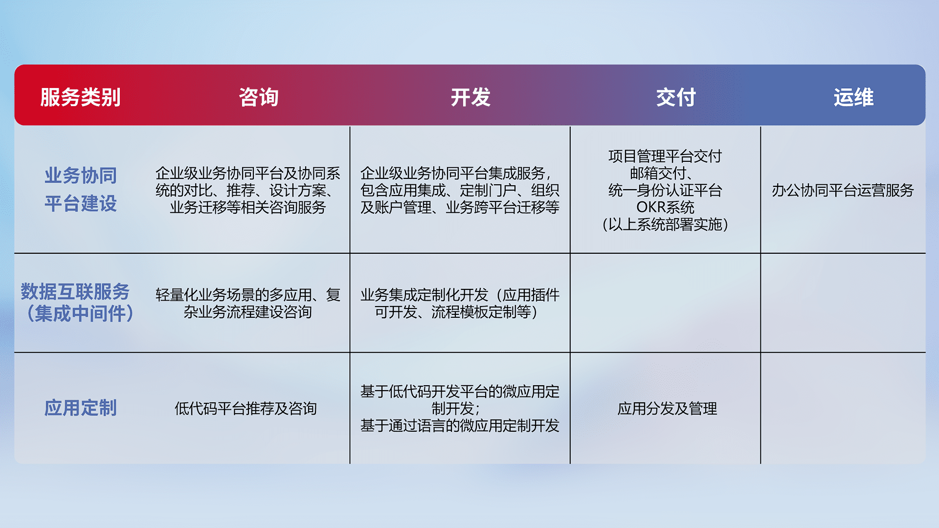 针对钉钉、、、企微、、IDaas等平台级产品提供产品的规划、、方案、、、交付、、定制化开发等服务,,,实现如统一协同办公、、、智能客户服务、、混合会议管理、、智能数据查询、、等业务场景,,,,实现数字化转型。。